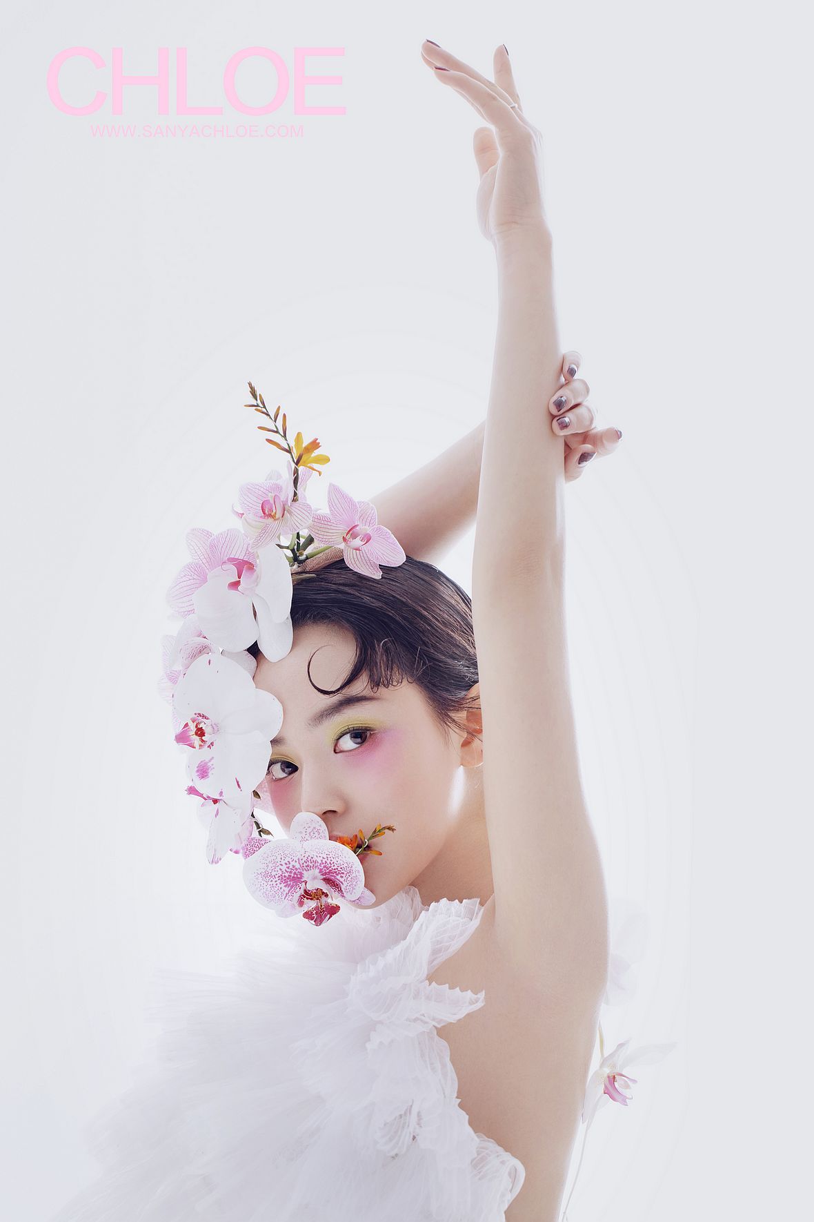 為了貼合主題,軼楠老師再次炫技,親手制作蝴蝶蘭鮮花配飾,大面積裝飾在臉部一側(cè),這樣一個(gè)大膽創(chuàng)意的搭配,是軼楠老師一直想要突破的傳統(tǒng)認(rèn)知里面的復(fù)古造型。