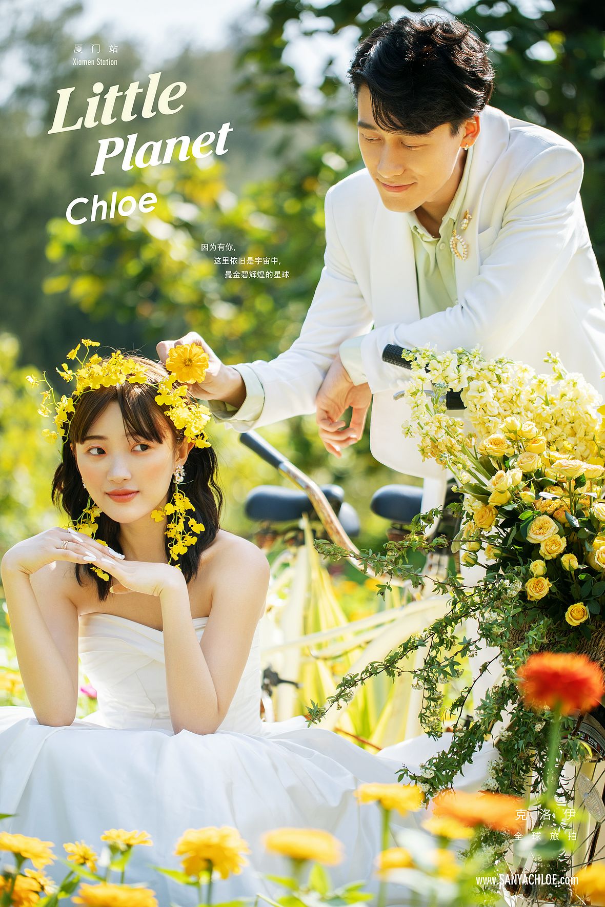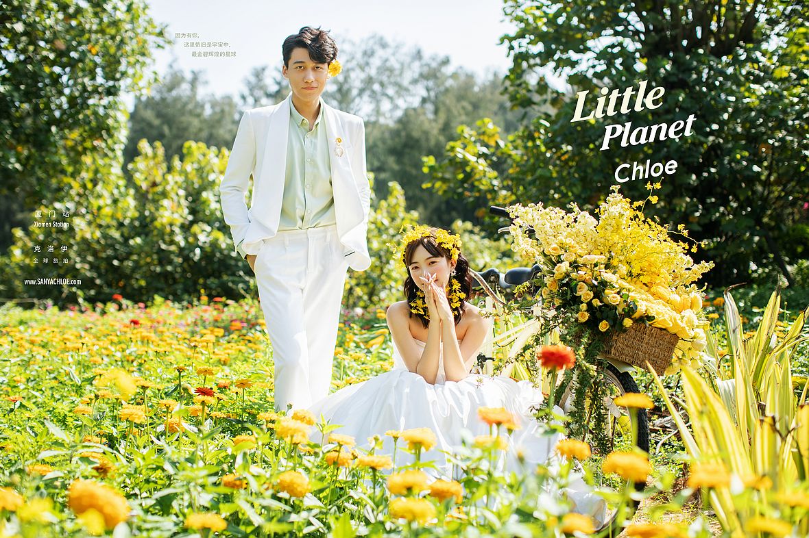 在廈門灣火山地質(zhì)公園的入園處,滿園的的春日景象分外迷人。園中開滿了色彩明艷的百日菊,綠意盎然生機(jī)蓬勃。春天就該與花共舞,關(guān)于春天的甜美婚紗照,就該這樣美好浪漫。